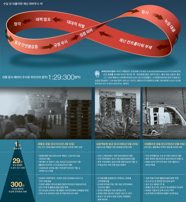 국내에서 발생한 대형 참사는 이처럼 예외 없이 판박이 닮은꼴이다. 수십 년째 일상적 안전불감증→규정 무시→안전검사와 검증 미비→참사→늑장 대응→재난 컨트롤타워 부재→요란한 처벌→뒷북 대책 발표→망각→일상 안전불감증으로 이어졌다. ‘재난의 뫼비우스 띠’ 안에 갇혀 맴돌고 있는 것이다.