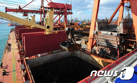 지난 2014년 1일 나진-하산 물류 시범운송을 위해 러시아 석탄을 싣고 북한 나진항을 거쳐 경북 포항신항에 도착한 신홍바오시(중국선적 3만2911t급)호에서 인부들이 석탄 하역작업을 하고 있다. 2014.12.1/뉴스1 ? News1 최창호 기자