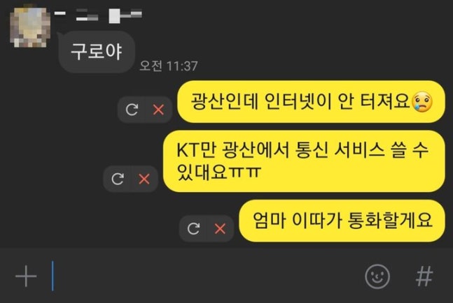 [영월=뉴시스] 윤정민 기자 = 강원 영월군 상동광산 안에서 기자가 부모님과 카카오톡 대화를 시도했으나 통신이 끊긴 모습. KT는 상동광산 안에도 LTE 통신 인프라를 설치했기 때문에 광산 안에서도 통신 서비스를 이용할 수 있다. 기자는 다른 통신사 서비스를 사용 중이다. 2023.07.11. alpaca@newsis.com *재판매 및 DB 금지[영월=뉴시스]윤정민 기자 = "너 집이 어디였지? 구로야?"혼자 자취하는 기자를 위해 11일 오전 반찬을 주러 서울에 온 어머니. 강원 영월군 상동광산에 온 기자는 끝내 어머니와 카카오톡 대화를 나눌 수 없었다. 취재를 위해 광산 안 깊숙이 들어가자 통신 자체가 끊겼기 때문이다.그런데 옆에 광산 작업자는 집에 있는 딸과 영상통화를 나누고 있었다. 음성·영상 품질 모두 문제가 없었다. 기자 스마트폰이 문제가 있던 게 아니었다. KT가 상동광산에 유일하게 기지국과 통신 케이블을 설치했기 때문에 KT에 가입하지 않는 기자만 광산 안에서 전화, 문자, SNS 등을 이용할 수 없었던 것이다.