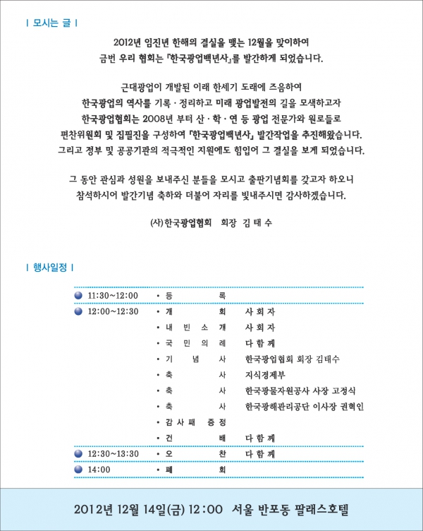 첨부. 한국광업백년사 출판기념회 초청장 1부.