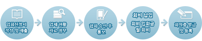입회신청서 작성 및 제출 (첨부자료 참조) ▶ 업체 현황 자료 첨부 ▶ 협회 승인 후 통보