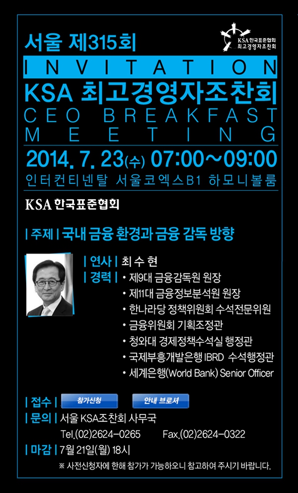 ○일 시 : 2014. 7. 23(수) 07:00 ~ 09:00 ○장 소 : 인터컨티넨탈 서울코엑스 B1 하모니볼룸홀 ○연 사 : 제 9대 금융감독원 원장 최 수 현 ○주 제 : 국내 금융 환경과 금융 감독 방향 ○신 청 : 7월 16일(17시) 까지 협회 02)751-3689로 연락주시기 바랍니다.